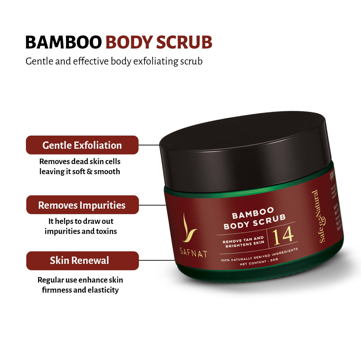 Get soft and glowing skin with our bamboo body scrub. It helps remove dirt and impurities, making your skin look healthy, soft, and bright.